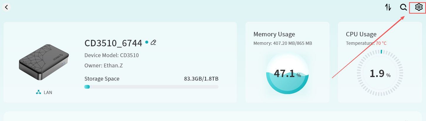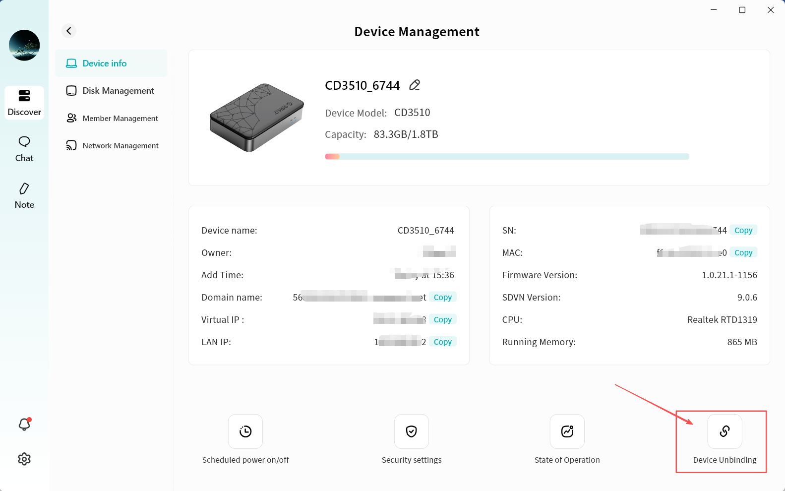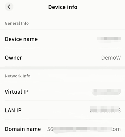 Tap the gear icon Set up to see device name, Owner account, virtual domain name, virtual IP, and LAN IP.