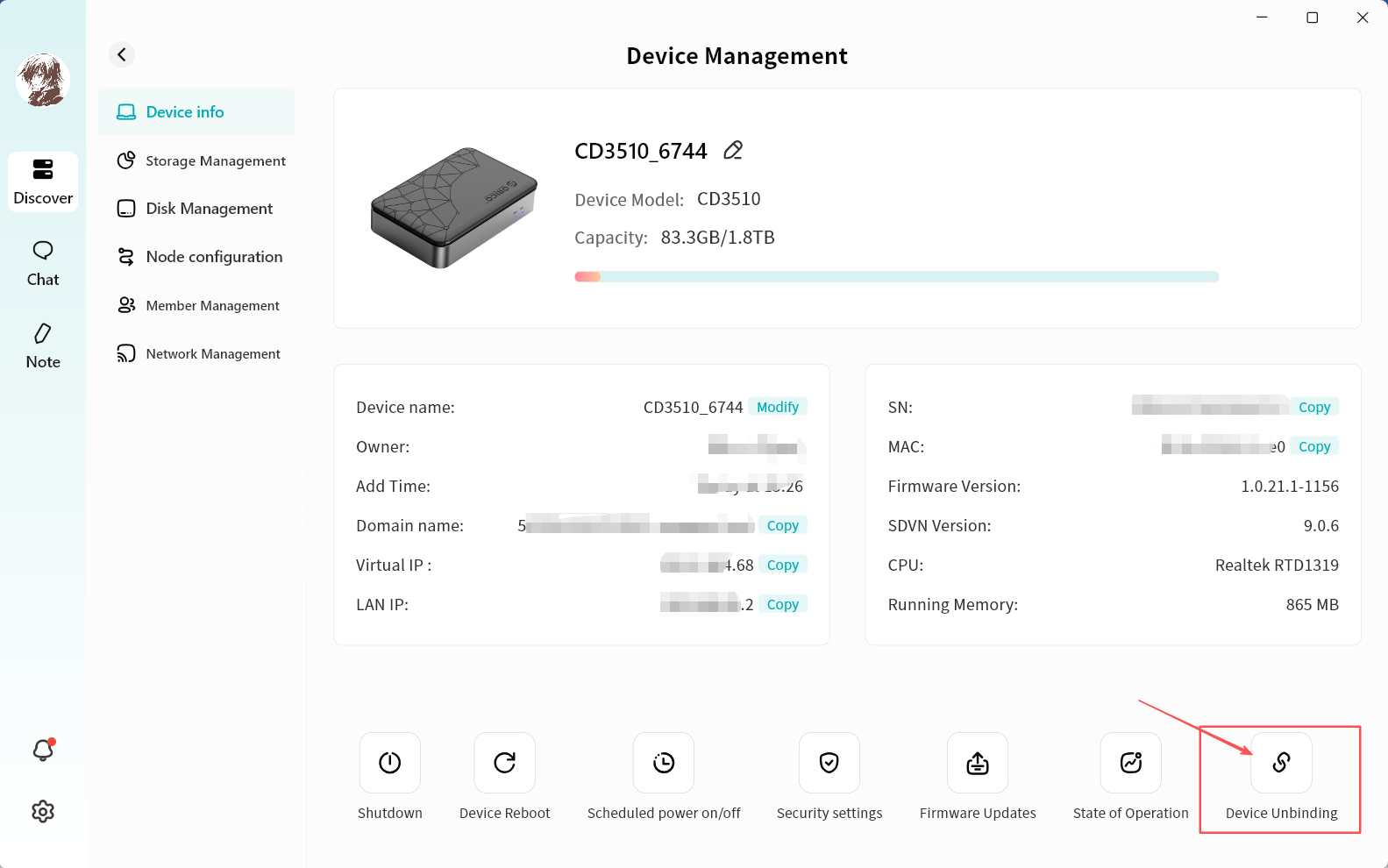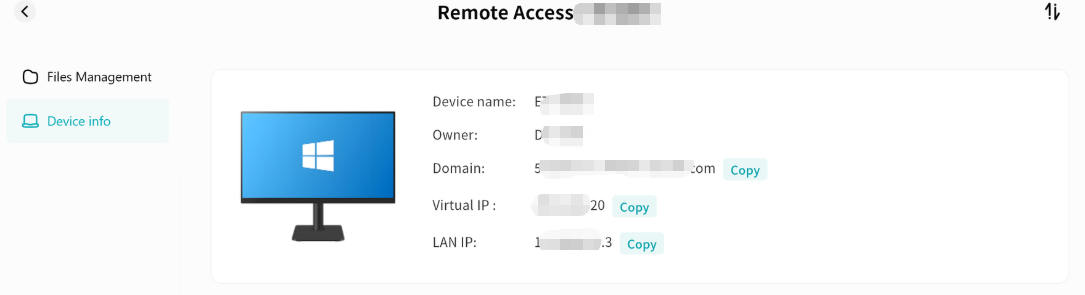 Displays device name, Owner account, virtual domain name, virtual network IP, and LAN IP.