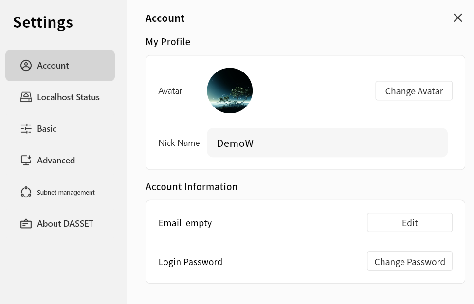 Change Avatar: Select an image from your computer as your DASSET account avatar. This avatar will also be visible to your contacts.