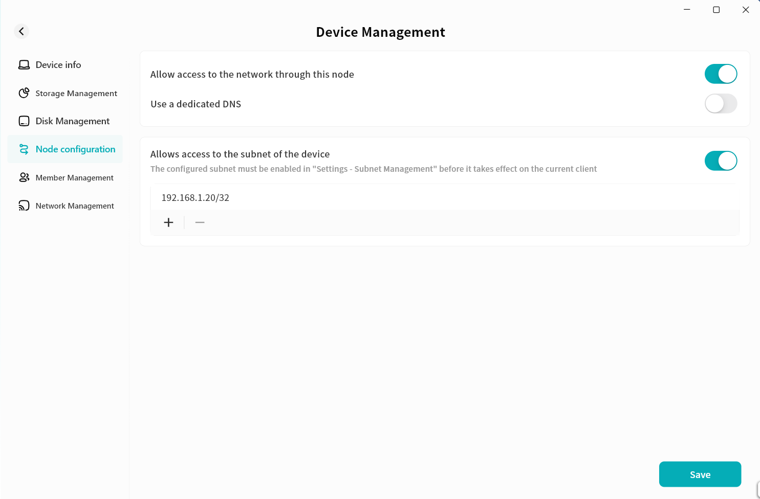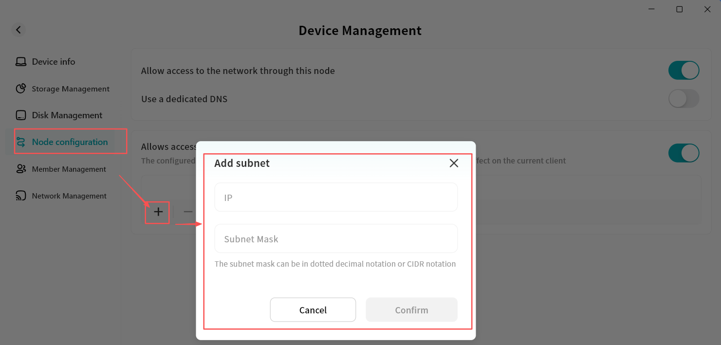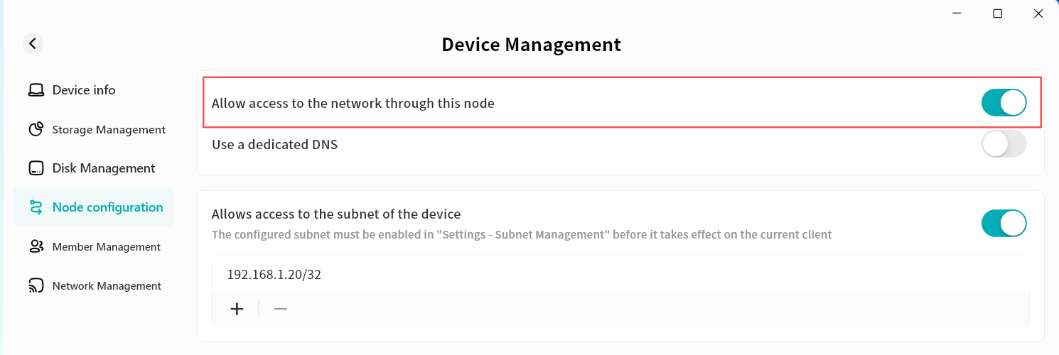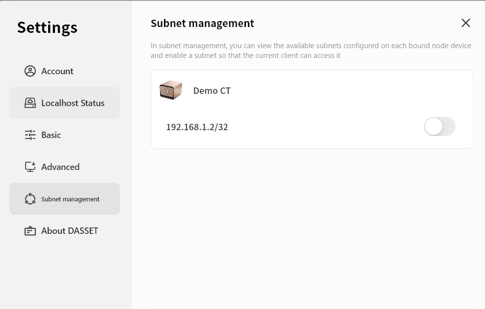 In Subnet Management, you can enable subnets shared by specific DASSET devices, allowing you to remotely connect to subnet addresses while logged into the DASSET client.