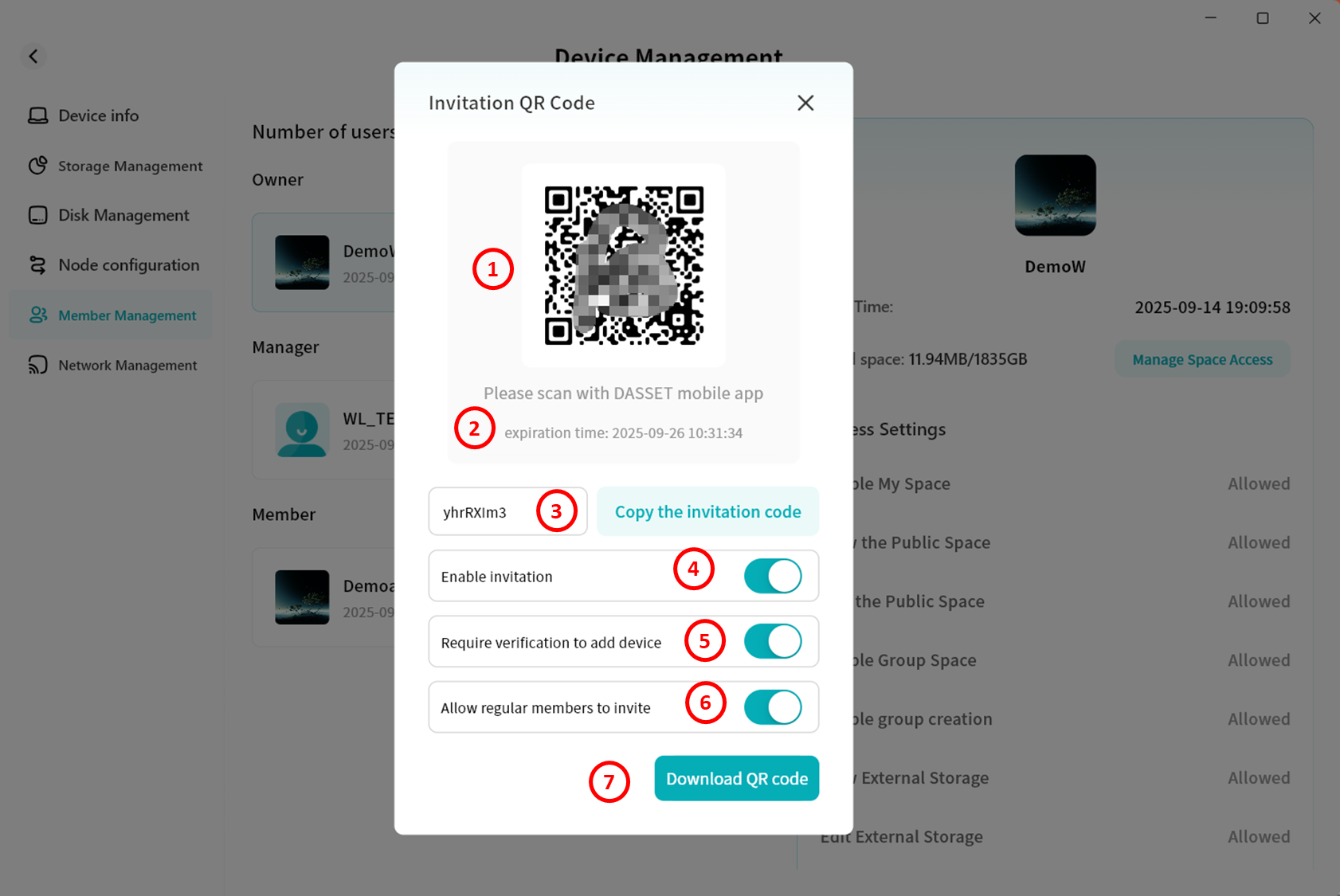 Invitation code: Enter the invitation code shared by another user to complete binding with their DASSET device.
